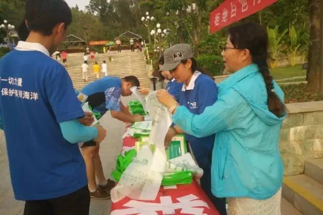 2016年4月22日是第47个世界地球日。蓝丝带海洋保护协会组织蓝丝带高校志愿者、免税店党员、临春岭公园员工在三亚市临春岭森林公园开展“抵制白色污染 倡导绿色生活”环保宣传活动。当天,蓝丝带协会与三亚市旅游协会共同向其会员单位及社会公众发出“抵制白色污染 呵护生态安全”环保倡议。