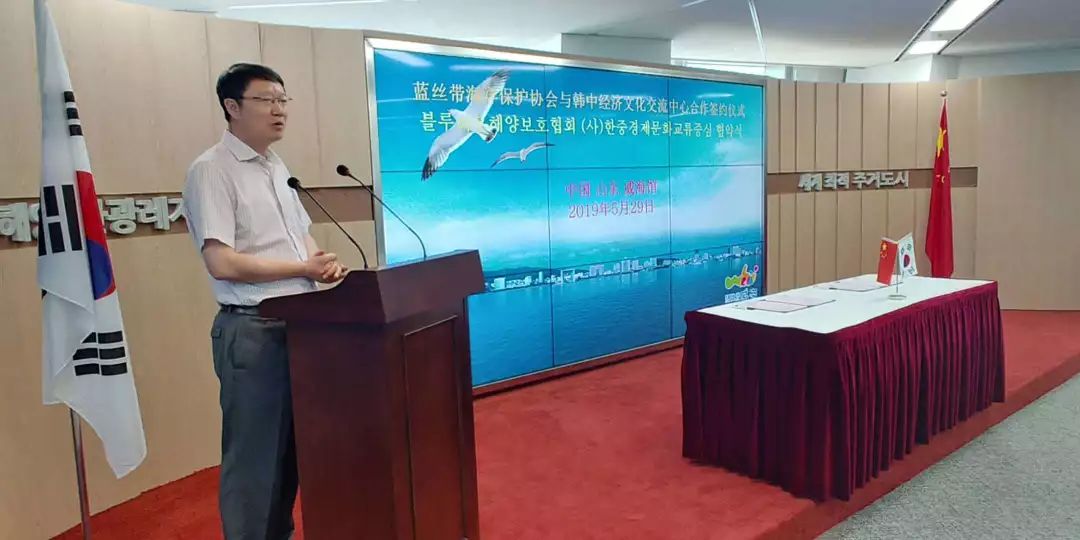 5月29日,蓝丝带海洋保护协会与韩中经济文化交流中心在韩国仁川威海馆举行了友好合作签约仪式。UNDP/GEF黄海大海洋生态系项目主任郭寅峰、韩中经济文化交流中心理事长李正鹤、蓝丝带海洋保护协会项目官员李真真、威海市华益社工中心理事长杨洪政、交流中心理事赵桢岩、山东艺博国际董事长刘大军等参加签字仪式。